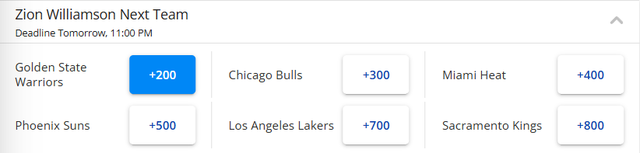 北京时间1月18日,锡安最新下家赔率出炉,勇士高居首位,他们成为了这位鹈鹕球星的头号热门下家。锡安下家赔率目前排在第1-6位的依次是勇士、公牛、热火、太阳、湖人和国王。随后美记James Piercey晒出了一份4换1的交易方案,认为这是双赢的选择。