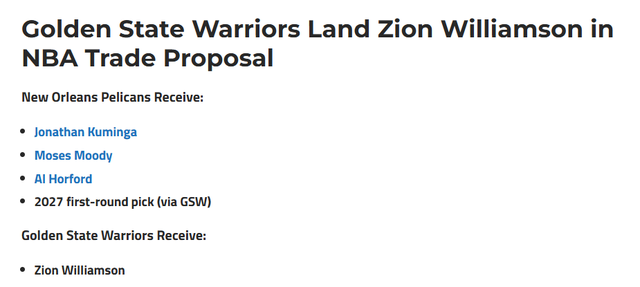 mk体育app-勇士成锡安头号热门下家!美记晒4换1交易方案:将库明加送往鹈鹕