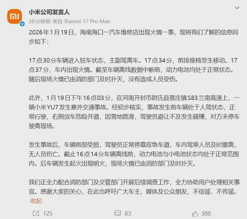 一天两辆小米汽车起火,雷军的苦恼停不下来。就在19日一天,小米汽车发生了两起事故,先是在下午4点,河南开封高速公路上,一辆小米YU7与一辆货车发生碰撞起火。事件原因基本清楚,小米汽车正常行驶,货车危险驾驶并道,小米汽车驾驶员因雪天路滑避让不及发生碰撞起火爆燃,肇事货车逃离现场。当日下午5点半发生在海口的一家汽车维修店的小米汽车起火事故,更典型也更值得深究。小...